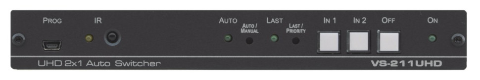 The VS−211UHD is an automatic switcher for 4K@60Hz (4:2:0) HDMI and analog audio signals. The VS−211UHD automatically switches one of two HDMI inputs to a predefined or last connected input whenever the currently active video signal is interrupted or whenever a higher−priority video signal is detected.