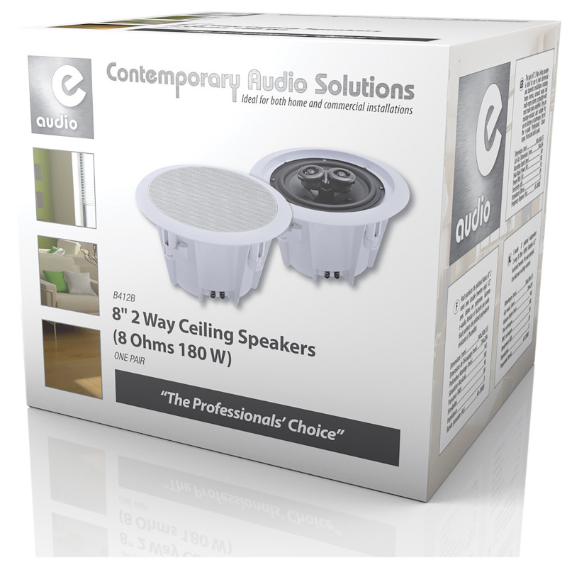 These 2-Way ceiling speakers are ideal for use in most commercial and domestic installations including home cinema, surround sound and multi-room systems; compatible with most multi-room amplifiers. The Ceiling Speakers are moisture-resistant, which makes them suitable for use in kitchens or bathrooms. The 1/2" High Polymer Tweeters offer clear, crisp sound reproduction, while the heavy duty rubber-edged base speaker gives enhanced bass response. Part of the e-audio Professionals' Choice range, the Ceiling Speakers are easy to fit and are supplied with a cutting template for convenience. Priced and sold in pairs.