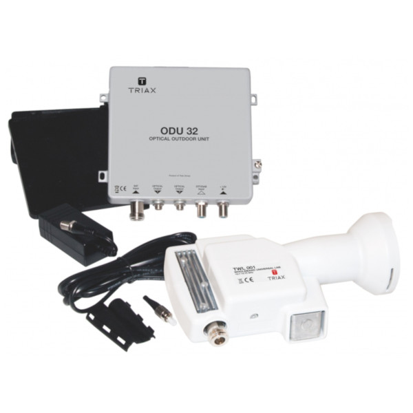 The TRIAX TOU232 is a one satellite optical Ku-Band LNB that provides a 1310 nm and 1550nm wideband optical output where all four satellite polarities and a TER signal (DAB/DTT/FM) are stacked into one frequency range (950-5450 MHz) for distribution through one single fibre optical cable. Provides a Link Budget equivalent to 2x32 = 64 ways of splitting.
